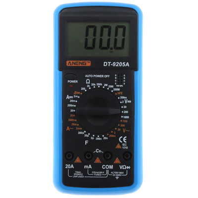 Spécification: Tension CC: 200m-2-20-200-1000V ± 0.5% Tension alternative: 200m-2-20-200-700V ± 1.0% Courant CC: 2m-20m-200m-20A ± 1.0% Courant alternatif: 2m-20m-200m-20A ± 1.5%Résistance: 200-2K-20K-200K-2M-20M-200M ± 1, 0% Capacitance: 20n-200n-2u-20u-200u F ± 4, 0% Diode: Oui Triode: OUIAlimentation: pile 9V (NON incluse)LCD à 3 chiffres, valeur daffichage maximale 1999 Taille: 190 x 90 x 35mm Poids: environ 310g Emballage inclus:1 x ANENG DT9205A Multimètre numérique portable 1 x fils de test Images détaillées:
