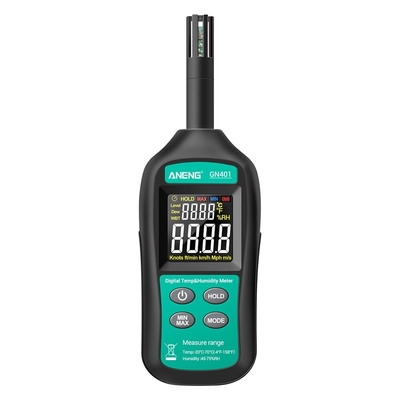 Traits: Capteur numérique de température et dhumidité de haute précision, haute précision, vitesse de réponse élevéeÉcran couleur HD LCDLunité de température peut être sélectionnée: ℃ / ℉ Mesure maximale et minimale: MAX, MINVerrouillage de lécran: HOLDMesure de la température du point de rosée Mesure de la température du bulbe humide Invite de dépassement de gamme La batterie faible rencontre linvite Spécification: Humidité: Plage: 0 ~ 100% HR Plage: 45 ~ 75% HR Précision ± 3, 0% HR Autres ± 4, 5% HRTempérature de lenvironnement: Gamme -20 ℃ ~ 70 ℃ Précision ± 1 ℃-4 ℉ ~ 158 ℉ précision ± 1, 8 ℉ Température du point de rosée: Gamme -20 ℃ ~ 70 ℃ Précision ± 1, 5 ℃-4 ℉ ~ 158 ℉ précision ± 2, 7 ℉ Température humide: Gamme -20 ℃ ~ 70 ℃ Précision ± 1, 5 ℃-4 ℉ ~ 158 ℉ précision ± 2, 7 ℉ Mise à jour numérique 0.5 S Arrêt automatique: 15 minutes darrêt automatique sans opération Température de fonctionnement et humidité -20 ℃ ~ 60 ℃ / -4 ℉ ~ 140 ℉ 10% HR ~ 90% HRTempérature et humidité de stockage -20 ℃ ~ 60 ℃ / -4 ℉ ~ 140 ℉ 10% HR ~ 75% HRAlimentation: 3 * 1.5V AAA (non inclus) Le forfait comprend:1 * thermohygromètre GN401 (Batterie non inclus)2 * fil de plomb de test 1 * manuel 1 * boîte demballage Détails Photos: