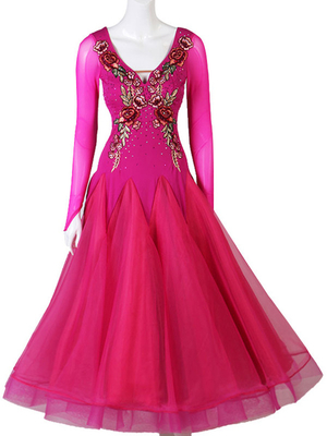 Costume De Danse De Salon Brodé À Volants Rose Rouge Femmes