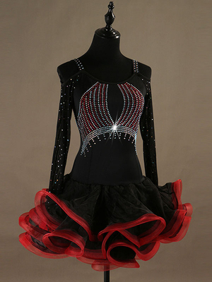 Costume De Danse Latine Femmes Bordeaux Perles Organza Volants Robes